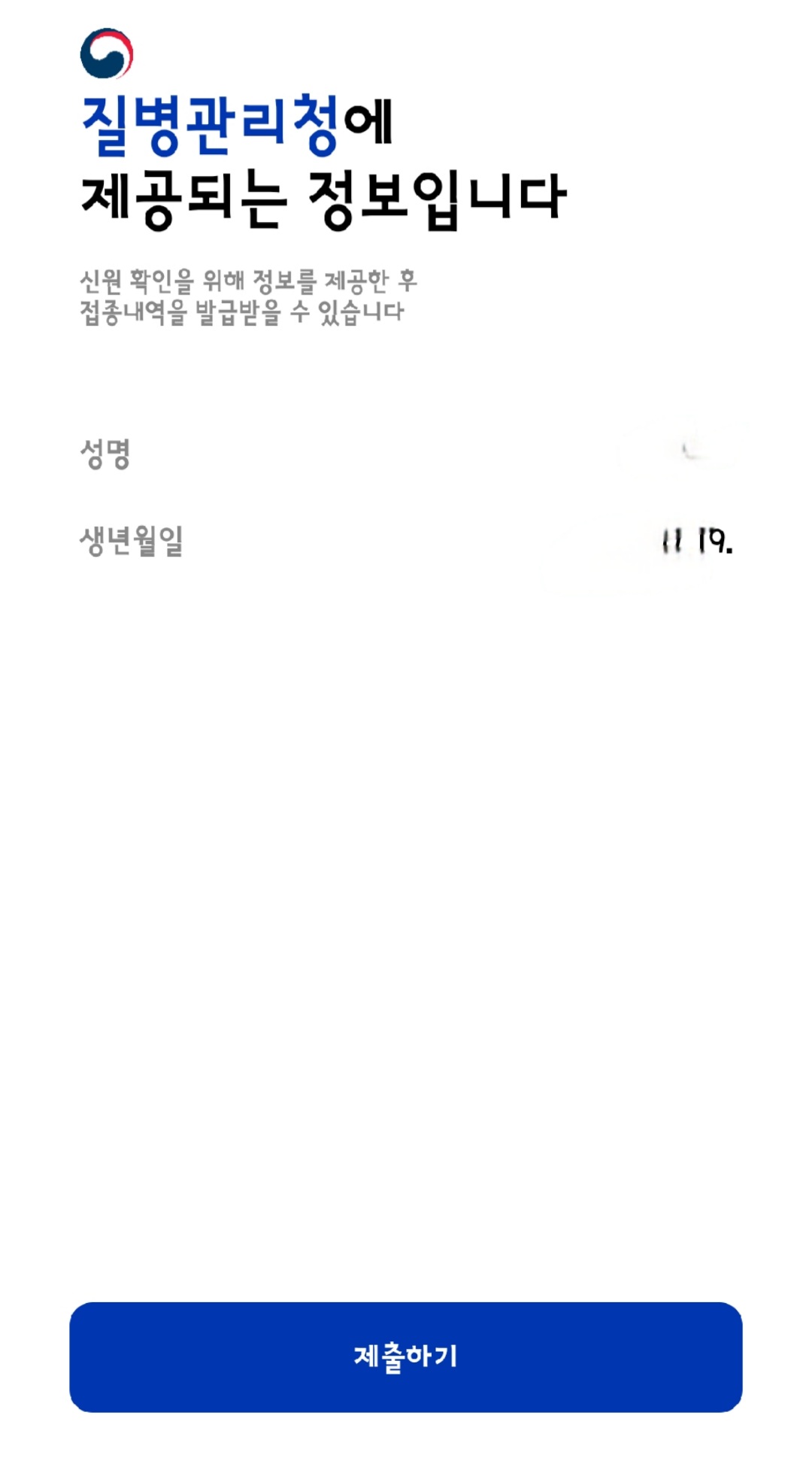 4. 코로나19 예방 접종 내역 발급받기 클릭 질병관리청에 제공된 정보를 확인 후 증명서 발급