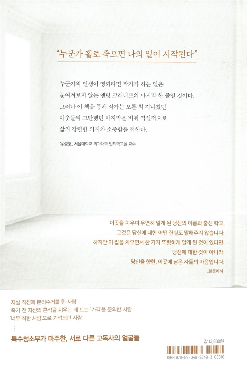 “누군가 홀로 죽으면 나의 일이 시작된다” 죽음 언저리에서 행하는 특별한 서비스에 대하여 수많은 언론이 집중 조명한 어느 특수청소부의 에세이 누군가 홀로 죽은 집, 쓰레기가 산처럼 쌓인 집, 오물이나 동물 사체로 가득한 집…. 쉽사리 볼 수도, 치울 수 없는 곳을 청소하는 특수청소업체 ‘하드웍스’ 대표 김완의 특별한 죽음 이야기『죽은 자의 집 청소』. ‘특수’청소라는 표현에서 알 수 있듯 그의 일터엔 남다른 사연이 가득하다. 자살 직전에 분리수거를 한 사람, 자신의 세간을 청소하는 ‘비용’을 물은 뒤 자살한 사람 등. 현장 이야기를 주로 다루는 1장에는 픽션이라고 생각될 만큼 비현실적인 현실 이야기가 펼쳐지고, 2장에선 특수청소부로서 느낀 힘듦과 보람부터 직업병, 귀신에 대한 오컬트적인 이야기까지 다채로운 에피소드로 그가 하는 일을 생생히 전한다. 특수청소부로 온갖 현장을 다니는 김완 작가의 시선을 천천히 따라가다 보면 고독사의 현실, 고독사의 민낯을 마주하게 된다. 노인뿐만 아니라 중년 그리고 청년에게까지 엄습하는 쓸쓸한 죽음. 세대와 성별을 가리지 않는 고독한 죽음 이야기를 하나둘 접하다보면 고정관념이 점점 깨진다. 생을 포기하기 직전까지 어떻게든 살아보려 삶의 절벽 끝에서 아등바등하던 흔적이 현장 곳곳에 남아 있다. 피와 오물, 생전 일상을 유추할 수 있는 여러 유품을 치우며 작가는 삶에 대해 사색한다. 그렇게 이 책은 ‘죽음’을 소재로 하지만 역설적이게도 ‘삶’을 이야기한다. 그래서인지 특수청소부의 현장 이야기가 마냥 무겁고 슬프지만은 않게 다가온다.