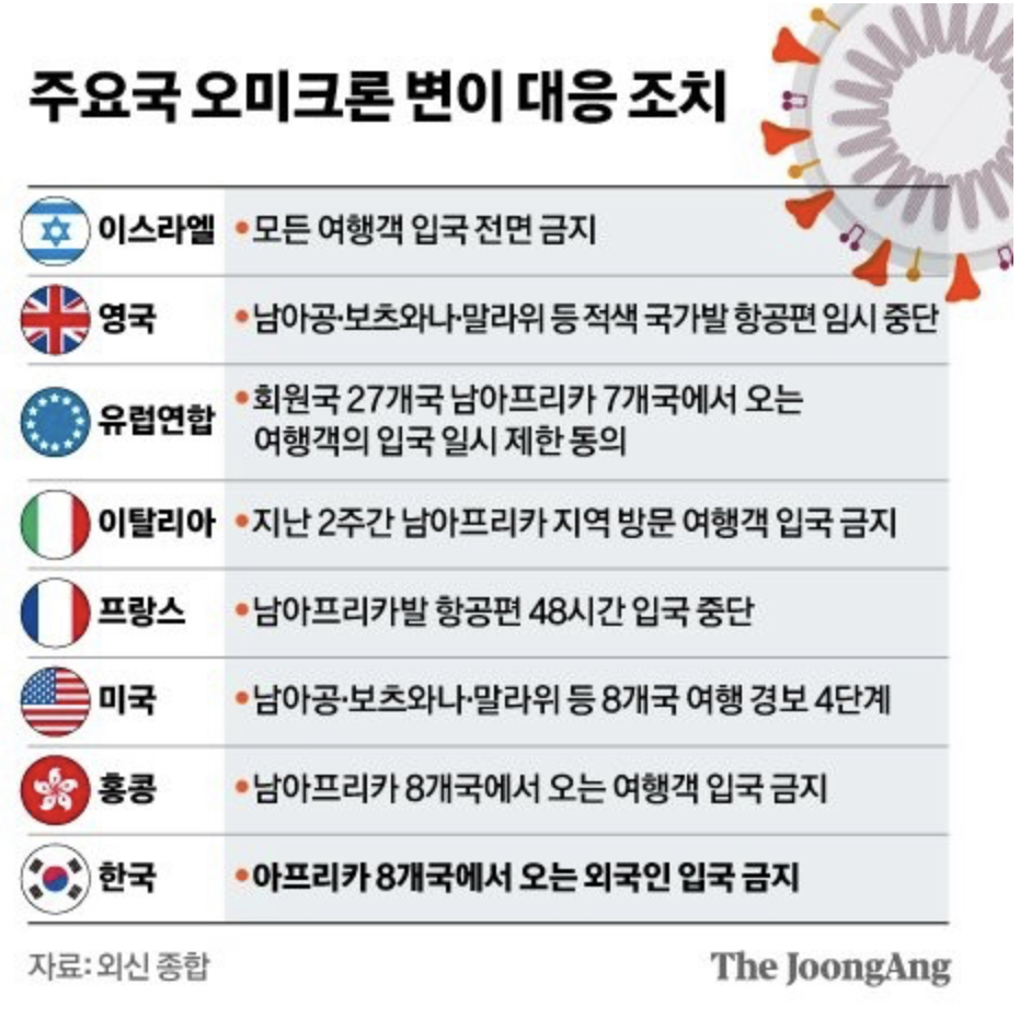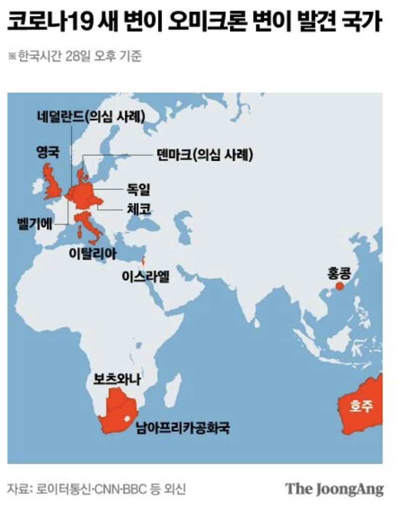 11월 14일 남아공에서 발견 이후 28일까지 유럽 12개국으로 확산되었다고 하니 심각한 변이 바이러스임을 알 수있습니다.