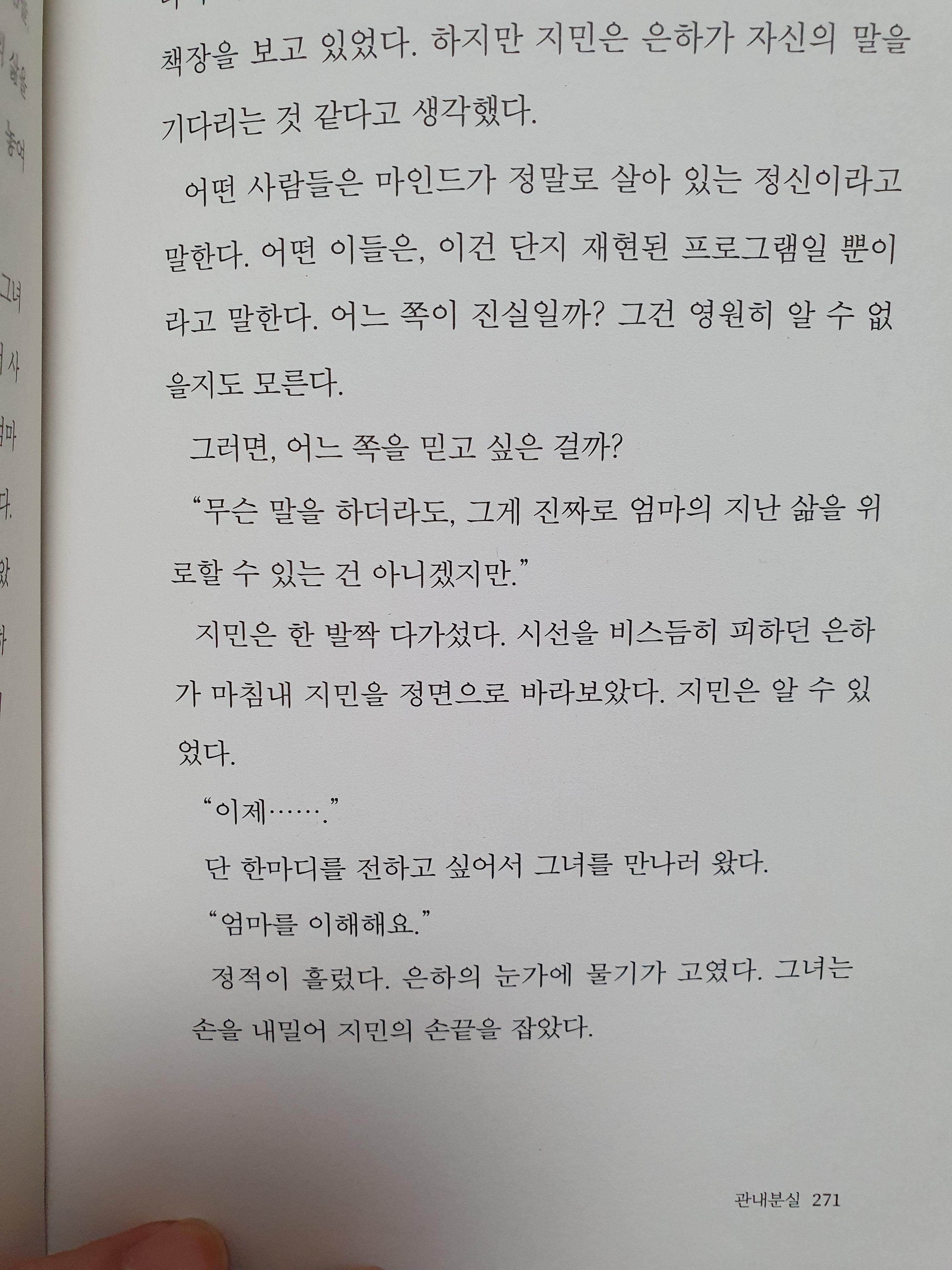 "아빠는 그동안 한 번도 엄마를 찾은 적 없어요? 그럼 접속해본 것도 아니고, 고작해야 유언을 들어준답시고, 가서 인덱스를 지워버린 게 다예요?"