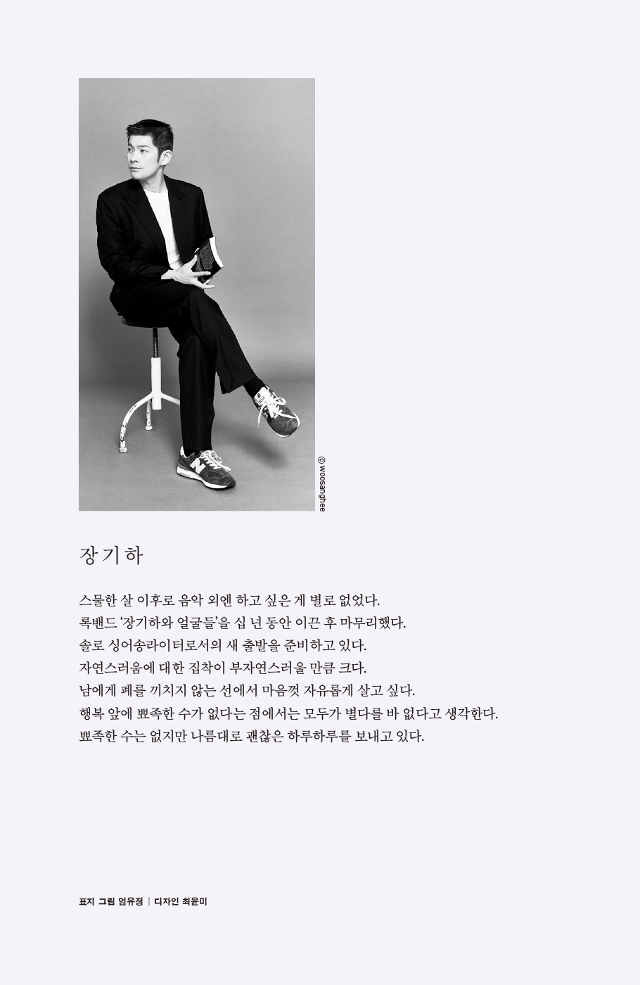 스물한 살 이후로 음악 외엔 하고 싶은 게 별로 없었다. 록밴드 ‘장기하와 얼굴들’을 십 년 동안 이끈 후 마무리했다. 솔로 싱어송라이터로서의 새 출발을 준비하고 있다. 자연스러움에 대한 집착이 부자연스러울 만큼 크다. 남에게 폐를 끼치지 않는 선에서 마음껏 자유롭게 살고 싶다. 행복 앞에 뾰족한 수가 없다는 점에서는 모두가 별다를 바 없다고 생각한다. 뾰족한 수는 없지만 나름대로 괜찮은 하루하루를 보내고 있다.